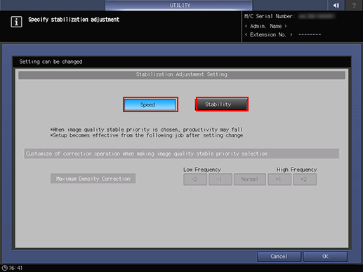 Select which to prioritize, print speed or image quality stability, for jobs. When you select image quality stability, set the frequency of maximum density correction for each item.