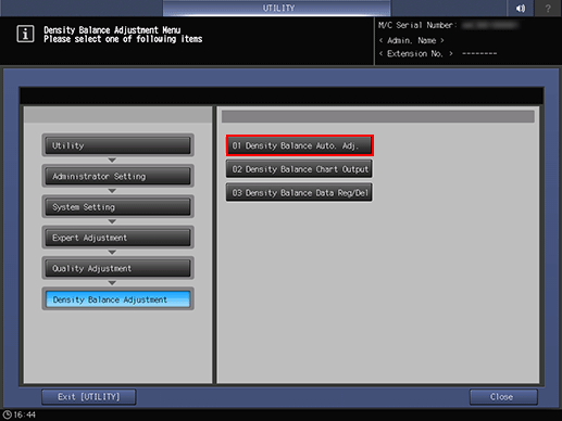 This operation is the same as that in Adjustment - Quality Adjustment - Density Balance Auto. Adj., accessing from the MACHINE screen.