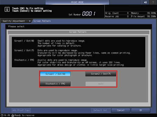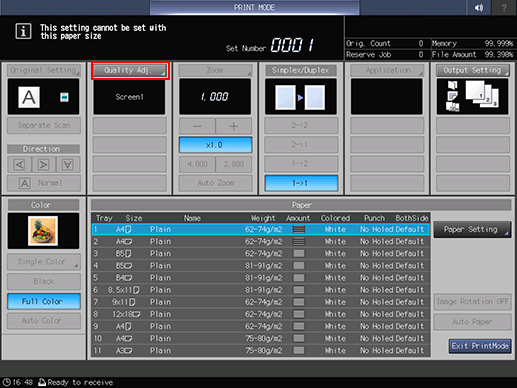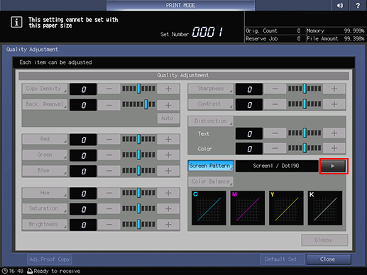 If there is density balance adjustment data for the screen that corresponds to the job, the density balance adjustment data is applied even if it does not correspond to the paper type and weight. This is because the screen that corresponds to is essential to correct the density balance. If using a special paper such as a thick paper or embossed paper, it is recommended to register the density balance adjustment data not only for the screen but also for the same paper type and weight as the job. The corrective effect on the density balance improves.