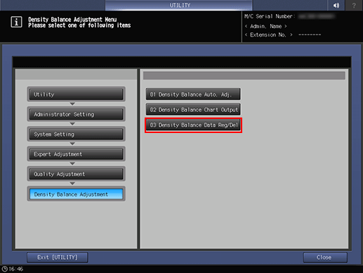 Press System Setting on the Administrator Setting Menu screen, and then press Expert Adjustment, Quality Adjustment, Density Balance Adjustment, and Density Balance Data Reg/Del in sequence.