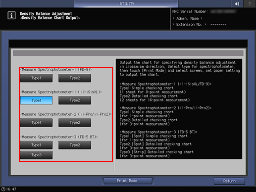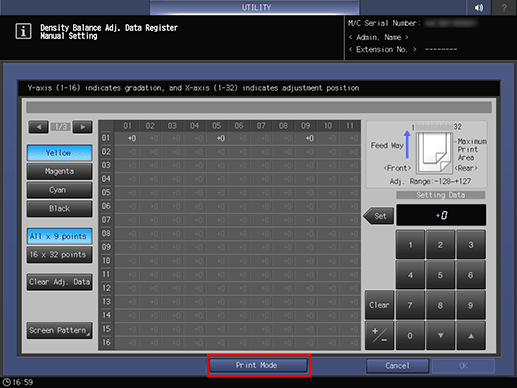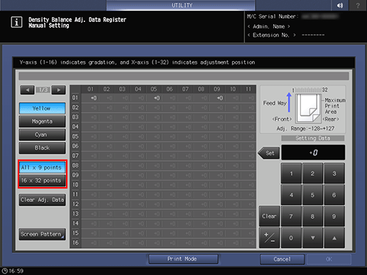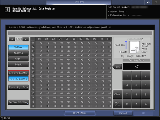 For manual setting of the density balance adjustment, the following two modes, All x 9 points and 16 x 32 points, are provided.
