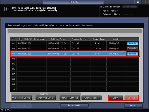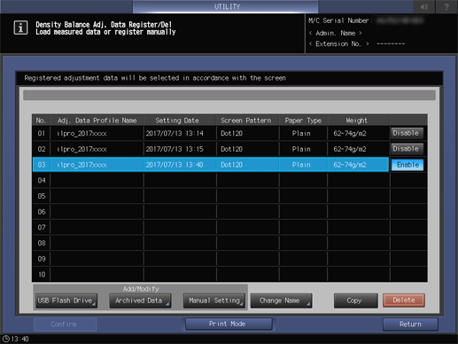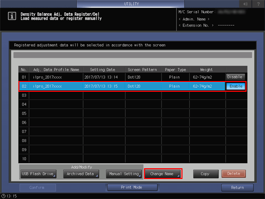 supplementary explanationIf multiple pieces of adjustment data are set for the same screen type, paper type, and weight, set Enable for the desired one. Others are automatically set to Disable.