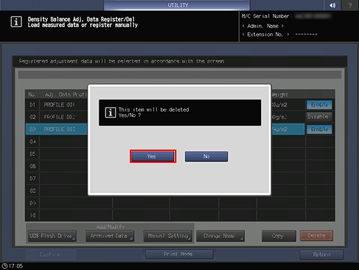 Press Density Balance Data Reg/Del on the Density Balance Adjustment Menu screen to display the Density Balance Adj. Data Register/Del screen.