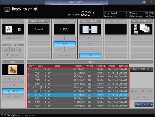 supplementary explanationLoad paper of 12 18 short edge feed, SRA3 short edge feed, 13 19 short edge feed, 11 17 short edge feed, or A3 short edge feed into the tray, and select the tray.