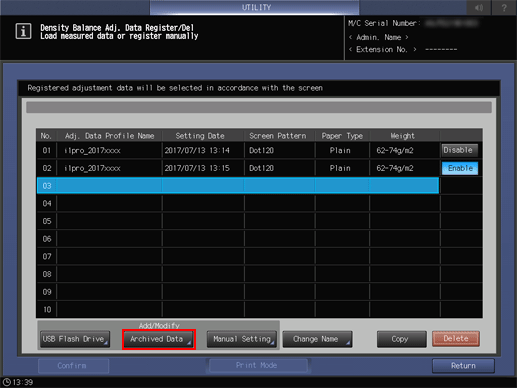 The density balance data being grayed out on the list do not function even if Enable is selected. This is because the screen type of dimmed data is not the same as that currently specified for the machine. If you select the same screen type as that displayed on the list in UTILITY, the dimmed data returns to the normal display, and it functions normally if you select Enable. For details about how to change the screen type, refer to Custom Screen.