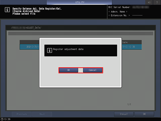 When the adjustment is completed, press OK on the Density Balance Adj. Data Register screen.