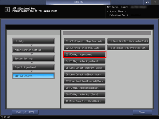 2. Press System Setting on the Administrator Setting Menu screen, and then press Expert Adjustment, ADF Adjustment, and FD-Mag. Adjustment in sequence.