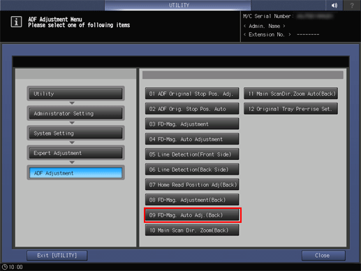 Press System Setting on the Administrator Setting Menu screen, and then press Expert Adjustment, ADF Adjustment, and FD-Mag. Auto Adj.(Back) in sequence.