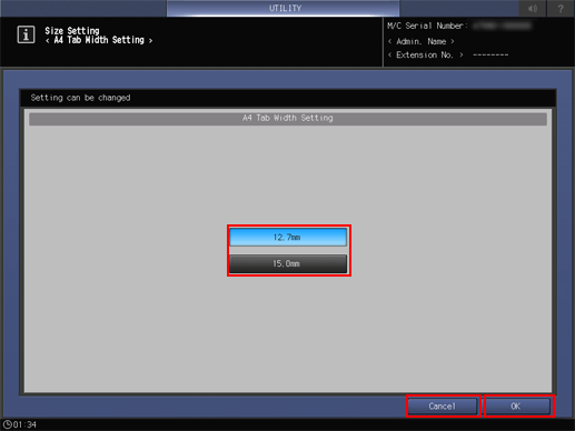 Press System Setting on the Administrator Setting Menu screen, and then press Size Setting and A4 Tab Width Setting in sequence.
