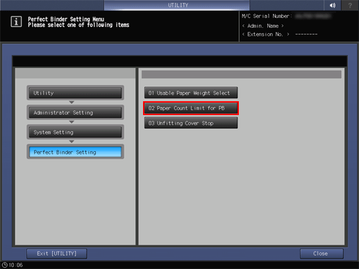 2. Press System Setting on the Administrator Setting Menu screen, and then press Perfect Binder Setting and Paper Count Limit for PB in sequence.