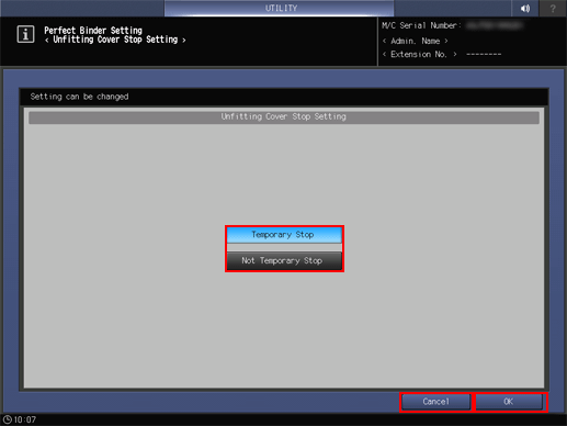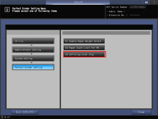 Press System Setting on the Administrator Setting Menu screen, and then press Perfect Binder Setting and Unfitting Cover Stop in sequence.