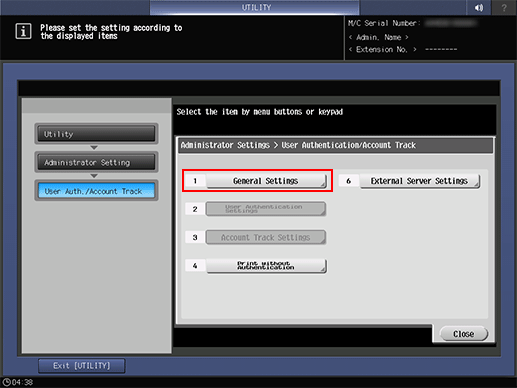 Press User Auth./Account Track on the Administrator Setting Menu screen, and then press General Settings.