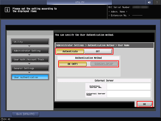 supplementary explanationIf you have selected Authenticate, select ON (MFP) or External Server Authentication.