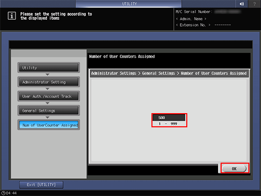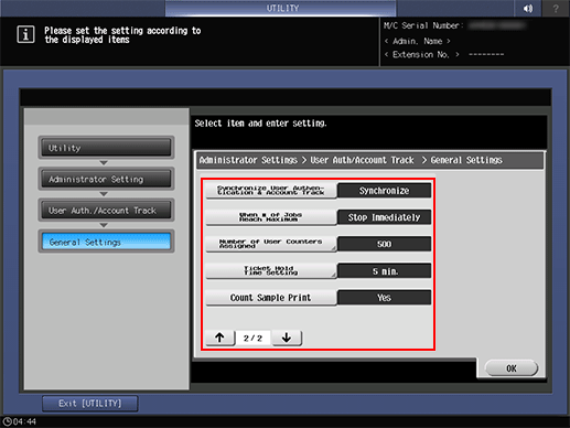 Num of UserCounter Assigned | Enter the number of User Authentication to distribute a total of 1,000 authentication entries. The number of entries for Account Track will be the remainder after subtracting the number of entries for User Authentication specified here from 1,000. | |