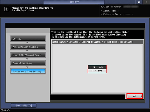 Ticket Hold Time Setting | This setting is applied when Active Directory is selected as the server type for external server authentication. Set a value in the range of 1 min. to 600 min. | |