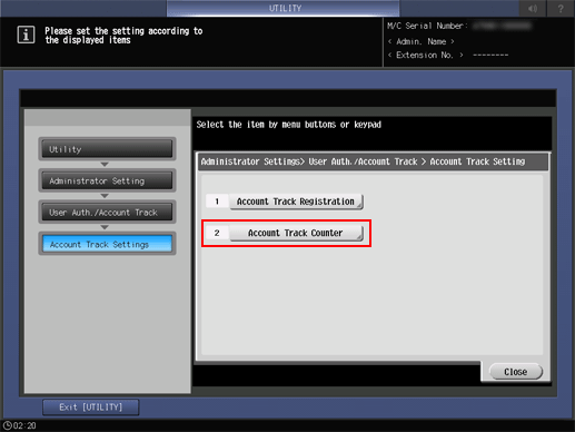 Press User Auth./Account Track on the Administrator Setting Menu screen, and then press Account Track Settings and Account Track Counter in sequence.