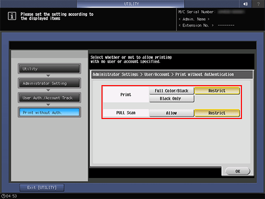 Select whether or not to allow Print and Pull Scan for which authentication is not required.