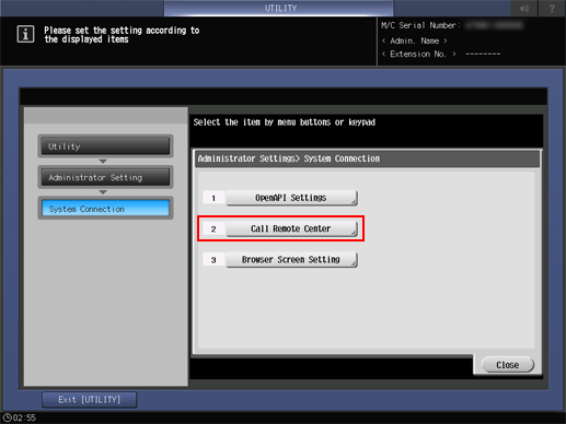 2. Press System Connection on the Administrator Setting Menu screen, and then press Call Remote Center.