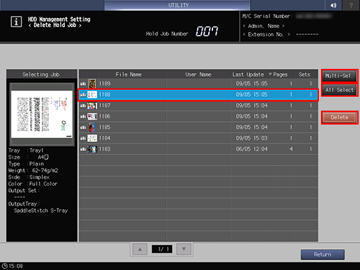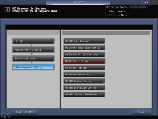 Press Security Setting on the Administrator Setting Menu screen, and then press HDD Management Setting and Delete hold Job in sequence.