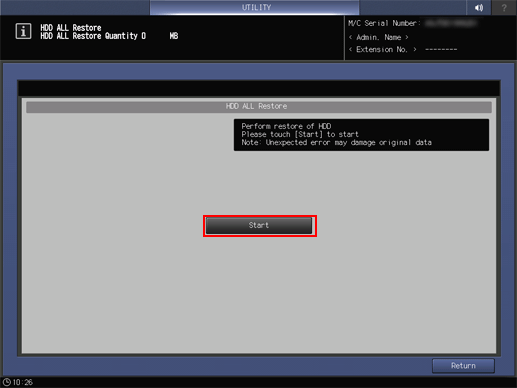 • If HDD ALL Restore fails during the operation or is canceled, the machine will restart. In this case, the data on the HDD will be completely deleted.