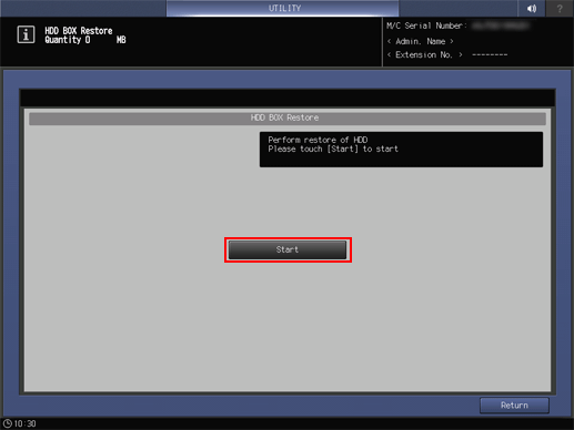 • If HDD BOX Restore fails during the operation or is canceled, the machine will restart. In this case, the data already restored on the HDD will not be cleared.