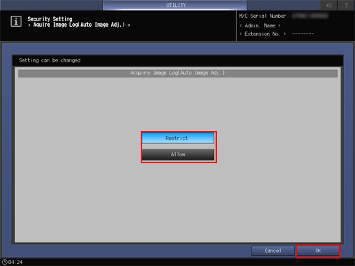 To prevent the service representative from acquiring logs without permission, this function is set to Restrict by default. Log acquirement is possible only when Allow is selected.