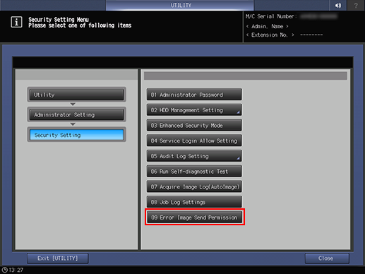 Press Security Setting on the Administrator Setting Menu screen, and then press Error Image Send Permission.