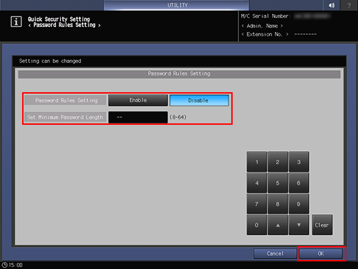 Selecting Enable sets the machine to accept passwords specified more strictly than usual, according to the password rules as described below.