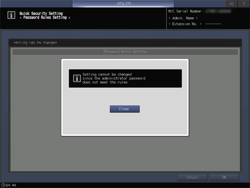 • supplementary explanationIf you press Enable while the default administrator password is kept unchanged, the administrator password does not comply with the rules, or a password with more characters than the number of characters set for the administrator password is entered for Set Minimum Password Length, a dialog is displayed stating that the selection has been rejected. Change the password to one that complies with the rules or enter a password containing the correct number of characters set for the administrator password. For details, refer to Administrator Password.