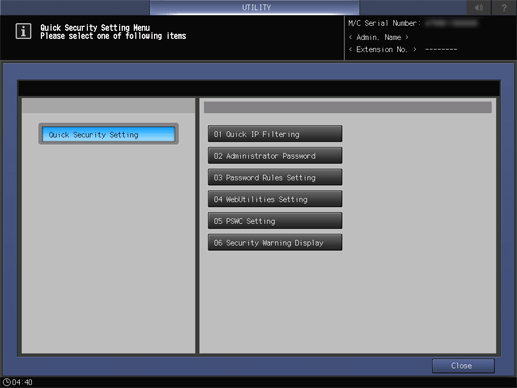 supplementary explanationIf pressing Set Now displays the Quick Security Setting screen, contact the administrator of your machine. When you press the Close, the default screen is displayed, you can use the machine normally.