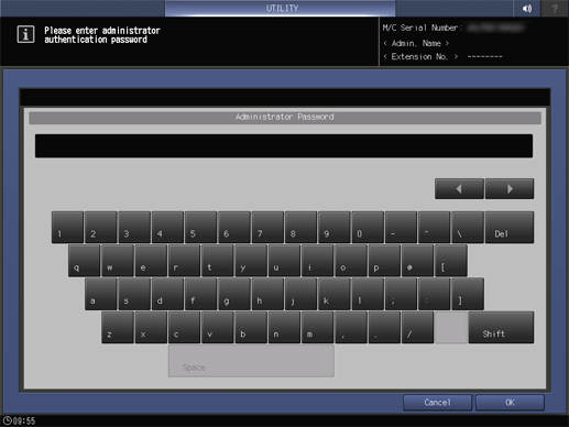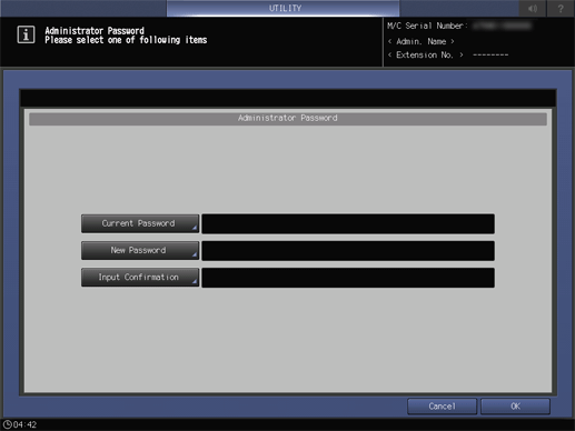 If the administrator sets a desired administrator password at Administrator Password on the Quick Security Setting, the administrator authentication function is automatically set to ON. After that, Quick Security Setting screen is undisplayable without the password input. If a general user presses Set Now, the administrator password input is demanded.