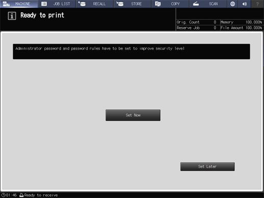 supplementary explanationIf pressing Set Now displays the Administrator Password screen, press Cancel. The default screen is displayed, you can use the machine normally.