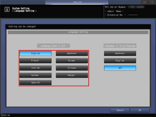 English is selected as default for the language used in LCD, and the voice message is deactivated.
