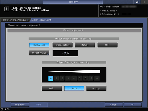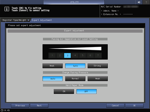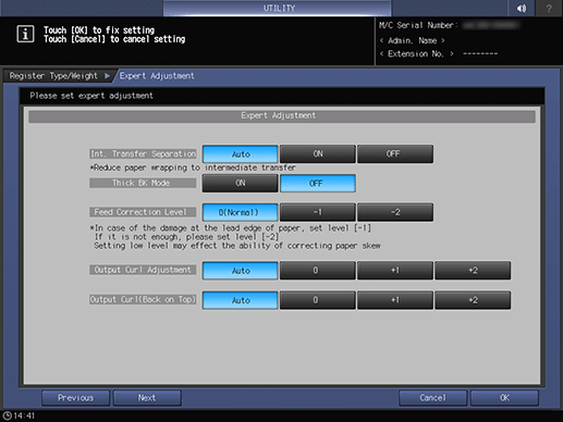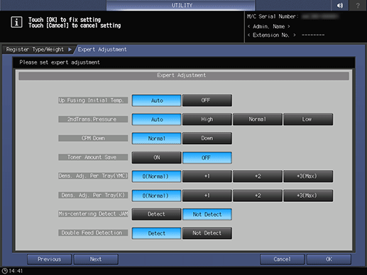 Up Fusing Initial Temp., 2nd Trans.Pressure, CPM Down, Toner Amount Save, Dens. Adj. Per Tray(YMC), Dens. Adj. Per Tray(K), Mis-centering Detect JAM, Double Feed Detection, Int. Transfer Separation, Thick BK Mode, Feed Correction Level, Output Curl Adjustment, Output Curl (Back on Top), Paper Feed Assist Set., Centering Adj.(Front), Centering Adj.(Back), Oscillation Setting, Fusing Air Separation Air Level Setting, Change Fusing Pressure, Hard Paper Mode, PFU Suction Air Level Setting, Output Paper Separation Setting, Output Cooling Air Level Adj.