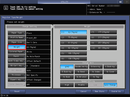 Weight | Select the paper weight. The unit of weight can be switched. The unit used to register the condition is also used to display that condition on the MACHINE screen and the COPY screen when called. | Weight: 62-74g/m2 / 16-19 lb Bond, 75-80g/m2 / 20-21 lb Bond, 81-91g/m2 / 22-24 lb Bond, 92-105g/m2 / 25-28 lb Bond, 106-135g/m2 / 29-36 lb Bond, 136-176g/m2 / 37-47 lb Bond, 177-216g/m2 / 48-57 lb Bond, 217-256g/m2 / 58-68 lb Bond, 257-300g/m2 / 69-81 lb Bond, 301-350g/m2 / 82-93 lb Bond Change Unit: g/m2, Duodecimo-kg, Octavo-kg, A Book-kg, B Book-kg, lb Bond, lb Index, lb Cover, lb Book, lb Bristol, lb Tag Speed Setting: High, Middle, Low, Auto Change |