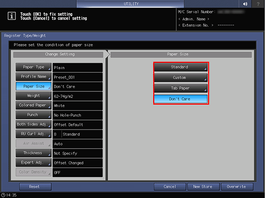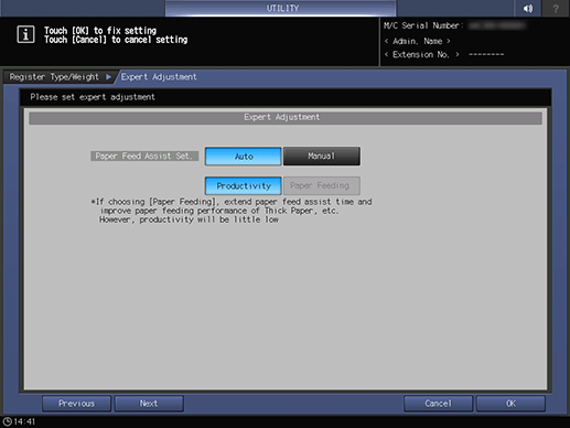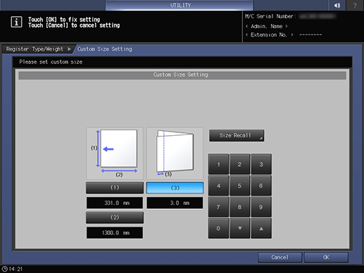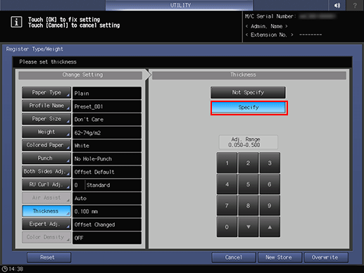 Thickness | Thickness is displayed on the screen when the machine is mounted with Image Controller IC-605. Selecting Specify allows the machine to estimate the remaining amount of paper in the tray with greater accuracy. | Not Specify, Specify Adjustment Range: 0.050 mm to 0.500 mm |
