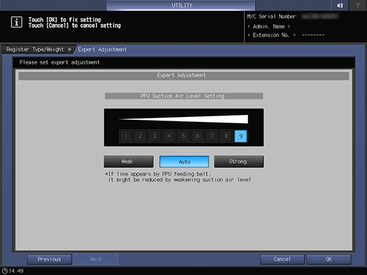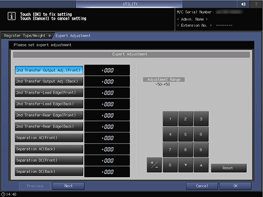 supplementary explanationFor items from 2nd Transfer Output Adj. (Front) to RU Speed Adjustment(Banner), select the desired adjustment item button, then use the keypad on the screen, press the down/up key, or press the keypad on the control panel to enter the numeric value.