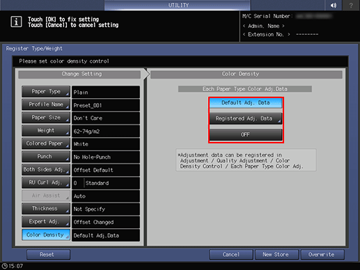 Color Density | The machine mounted with Relay Unit RU-518 provides Color Density on the screen. When Color Density Control - Basic Setting - Use Color Density Control is set to ON on the Adjustment Menu screen, you can configure the color density control settings. | Each Paper Type Color Adj. Data: Default Adj. Data, Registered Adj. Data, OFF |