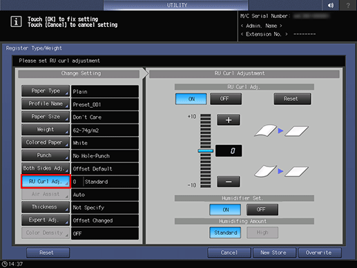 RU Curl Adj. | The machine mounted with the optional Relay Unit RU-518 provides RU Curl Adjustment on the screen, which allows you to correct the curl (arc-like distortion) of output paper. When Humidifier HM-103 is mounted on Relay Unit RU-518, you can set Humidifier Set. to ON or OFF. | RU Curl Adj.: -10 to +10 Humidifier Set.: ON, OFF Humidifying Amount: Standard, High |