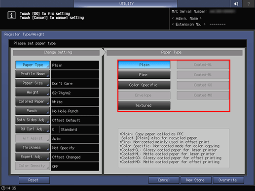 Paper Type | The following eight paper types are provided according to the plainness of paper. | Plain, Fine, Color Specific, Coated-GL, Coated-ML, Coated-GO, Coated-MO, Envelope, Textured |
