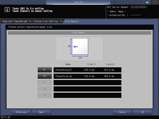 supplementary explanationUse Previous and Next to scroll to the desired custom size. Entries from 01 to 20 are provided on the screen.