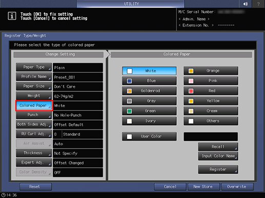 Colored Paper | Specify the color of paper. This prevents erroneous printing on papers in mixed colors. | White, Blue, Goldenrod, Gray, Green, Ivory, Orange, Pink, Red, Yellow, Cream, Others, User Color |