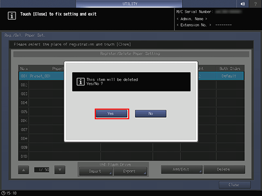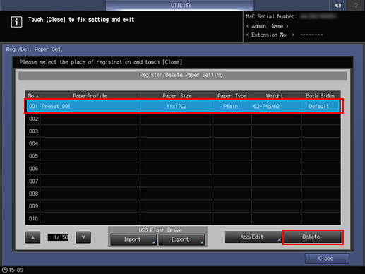 In each case, the screen returns to the Register/Delete Paper Setting screen.