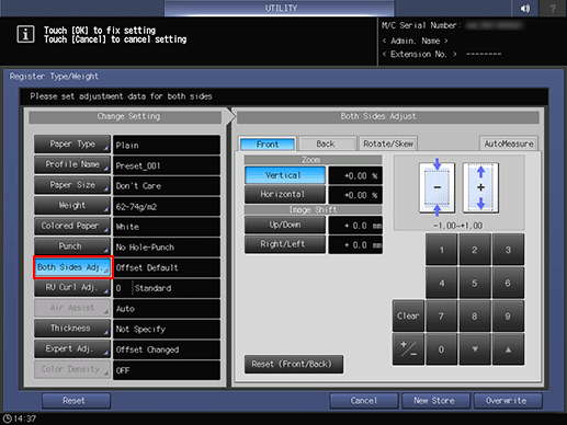 Both Sides Adj. | Adjust Zoom (Vertical or Horizontal), Image Shift (Up/Down or Right/Left), and Rotate/Skew (rotation or distortion) in each of Front and Back to align the image position between the front and back sides for printing when performing 2-sided printing. It is advisable to perform Both Sides Adjust for every paper to be used, as the shrinkage ratio differs according to the paper type, paper brand, or difference in temperature of storage location. When Intelligent Quality Optimizer IQ-501 is mounted on the machine, you can set Periodical Adjustment to ON or OFF in AutoMeasure. | Objects of adjustment: Front Zoom: Vertical: -1.00 % to +1.00 % Horizontal: -1.00 % to +1.00 % Image Shift: Up/Down: -10.0 mm to +10.0 mm Right/Left: -3.0 mm to +3.0 mm Objects of adjustment: Back Zoom: Vertical: -1.00 % to +1.00 % Horizontal: -0.80 % to +0.80 % Image Shift: Up/Down: -10.0 mm to +10.0 mm Right/Left: -3.0 mm to +3.0 mm Objects of Adjustment: Rotate/Skew Front: Rotate, Skew: -1.00 to +1.00 Back: Rotate, Skew: -1.00 to +1.00 Periodical Adjustment: ON, OFF |
