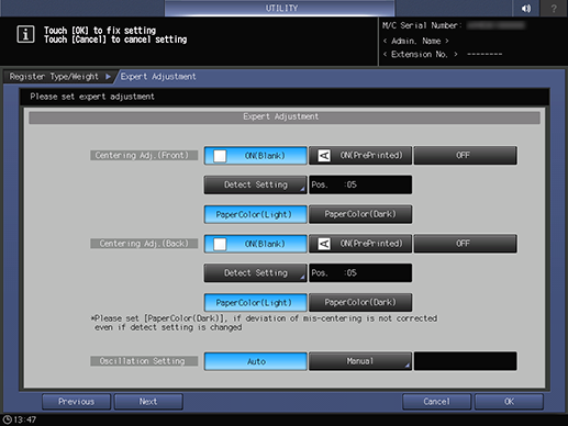 Expert Adj. | Sets the transfer, separation, or fusing process and other advanced adjustments. Expert Adjustment is not displayed by default. Contact your service representative. For details about the Mis-centering Detect JAM setting, refer to Print Job JAM Setting. The displayed or specifiable items vary depending on the optional units mounted on this machine. | 2nd Transfer Output Adj.(Front): -50 to +50 2nd Transfer Output Adj.(Back): -50 to +50 2nd Transfer-Lead Edge(Front): -50 to +50 2nd Transfer-Lead Edge(Back): -50 to +50 2nd Transfer-Rear Edge(Front): -50 to +50 2nd Transfer-Rear Edge(Back): -50 to +50 Separation AC(Front): -600 to +600 Separation AC(Back): -600 to +600 Separation DC(Front): -60 to +60 Separation DC(Back): -60 to +60 Upper Fusing Roller Temperature: -20 to +20 Lead Edge Erase Quantity: 0 to +200 Temp. Gap of Fus. Edge and Mid.: -10 to +10 Lower Fusing Roller Temperature: -15 to +70 Rear Edge Erase Quantity: 0 to +200 Back on Top Output Timing Adj.: 0 to +10 ADU Reverse Timing: -6 to +6 Fusing Speed(Front Side): -200 to +200 Fusing Speed(Back Side Offset): -200 to +200 Registration Loop(Front): -99 to +99 Registration Loop(Back): -99 to +99 Registration Speed: -50 to +50 Reverse De-Curler Speed: -200 to +200 Reverse Speed(RevExit): -200 to +200 Reverse Speed(ADU): -200 to +200 Banner Reverse Speed1: -200 to +200 Output De-Curler Speed: -200 to +200 LCT BannerRegist.Speed: -15 to +5 Regist. Speed(Banner): -50 to +50 Banner Reverse Speed2: -200 to +200 Reverse Gate SW Timing: -30 to +30 RU Speed Adjustment(Banner): -100 to +100 Pre-regist. Loop Adj. (Front)*: -99 to +99 Pre-regist.Loop:1st Connection*: -99 to +99 Pre-regist.Loop:2nd Connection*: -99 to +99 Pre-regist.Loop:BypassConnection*: -99 to +99 Pre-regist.Loop:Tray6 Connection*: -99 to +99 Up Fusing Initial Temp.: Auto, OFF 2nd Trans. Pressure: Auto, High, Normal, Low CPM Down: Normal, Down Toner Amount Save: ON, OFF Dens. Adj. Per Tray (YMC): 0 (Normal), +1, +2, +3 (Max) Dens. Adj. Per Tray (K): 0 (Normal), +1, +2, +3 (Max) Mis-centering Detect JAM: Detect, Not Detect Double Feed Detection: Detect, Not Detect Int. Transfer Separation: Auto, ON, OFF Thick BK Mode: ON, OFF Feed Correction Level: 0 (Normal), -1, -2 Output Curl Adjustment: Auto, 0, +1, +2 Output Curl (Back on Top): Auto, 0, +1, +2 Paper Feed Assist Set.: Auto, Manual, Productivity, Paper Feeding Centering Adj.(Front): ON(Blank), ON(PrePrinted), OFF, Detect Setting (only when Detect Position is set to 5 to 25 mm and Detect Range is set to 1 to 10 mm (ON(PrePrinted))), Paper Color(Light), Paper Color(Dark) Centering Adj.(Back): ON(Blank), ON(PrePrinted), OFF, Detect Setting (Detect Position: 5 to 25 mm, Detect Range: 1 to 10 mm (only when ON(PrePrinted)) is selected), Paper Color(Light), Paper Color(Dark) Oscillation Setting: Auto, Manual Fusing Air Separation Air Level Setting: Weak, Auto, Strong (1 to 7) Change Fusing Pressure: Auto, Normal, Weak Hard Paper Mode: ON, OFF PFU Suction Air Level Setting: Weak, Auto, Strong (1 to 9) Output Paper Separation Setting: ON(Coated), ON(Uncoated), Manual, OFF, Offset Value, Offset Value (-50 to +100) Output Cooling Air Level Adj.: Weak, Auto, Strong (0 to 8) |