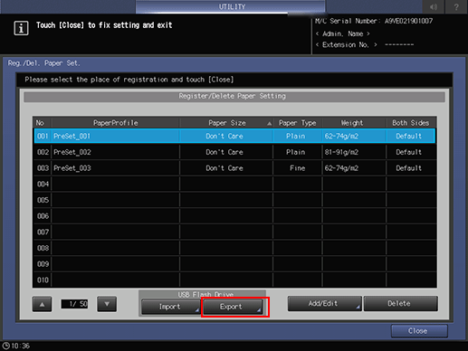 Select the paper setting data to be exported, check that the USB flash drive is connected, then press Export.