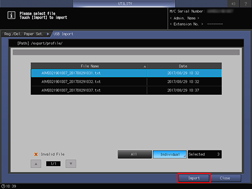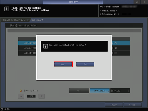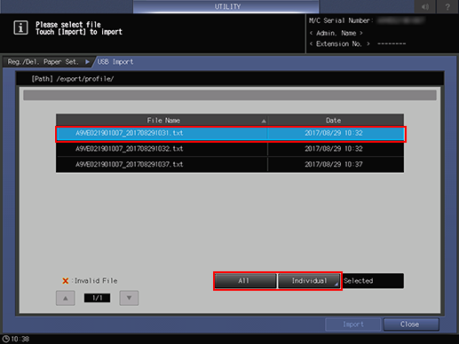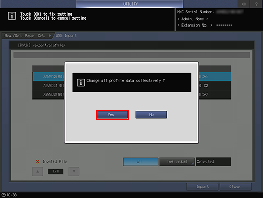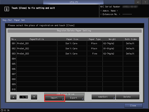 When using the importing [All] option, all the data of paper size and paper setting stored on the USB flash drive is imported and the data registered on the machine is overwritten.