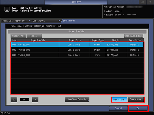 When using the importing [individual] option, the paper setting data you select is imported and the data is newly stored or overwritten on the machine. With the [New Store] option, up to 500 data, together with the number of the data that has already been registered on the machine, can be imported. (The remaining data after reduction of the registered data from 500 can be imported.) With the [Overwrite] option, up to 500 data can be imported.