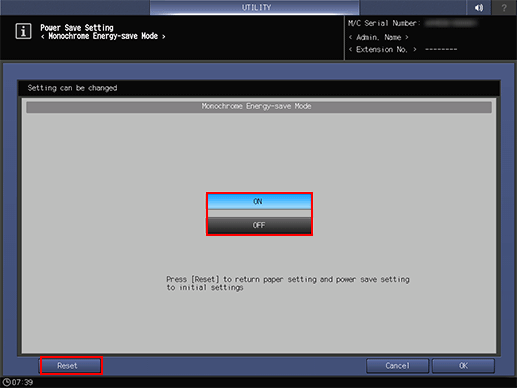 To reset the setting of Paper Setting for the main body tray, Power Save Function Setting, and Mono Energy-save Mode, press Reset, and select Yes in the dialog box.