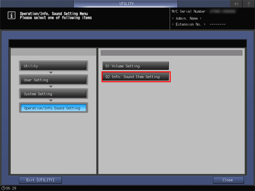 Press System Setting on the User Setting Menu screen, and then press Operation/Info. Sound Setting and Info. Sound Item Setting in sequence.